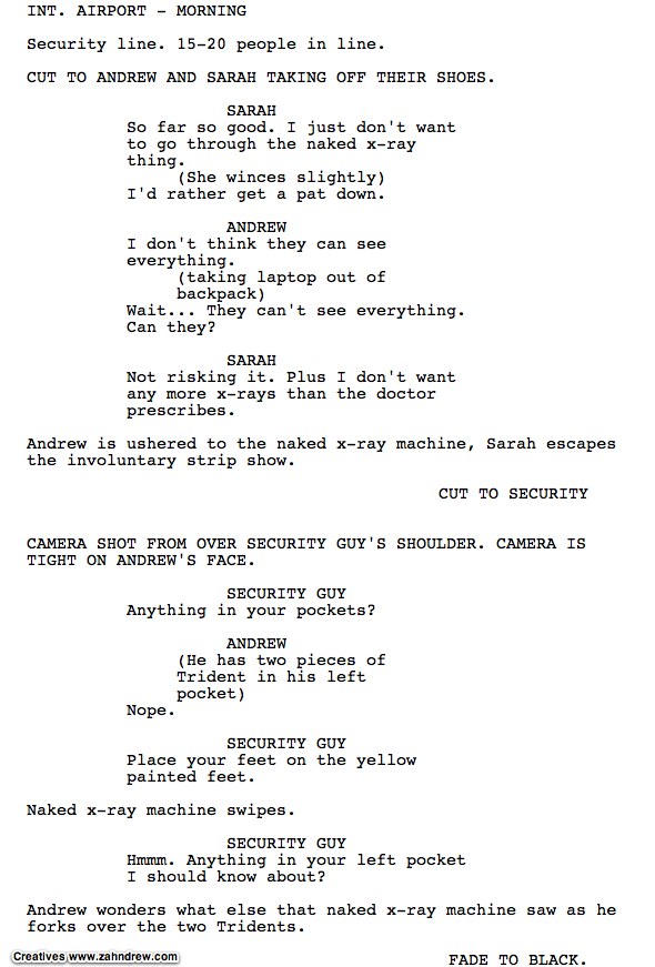 Christmas Airport Travel Scripted Credit: Eliane Alhadeff (Creative Commons) Airport security. Holiday travel. Pat downs and other awkwardness. The true story of a holiday travel encounter with airport security: scripted Hollywood style. Merry Christmas! emailShare this:TwitterFacebookLinkedInEmail Related By Andrew Zahn I'm a son, husband, dad, business owner, actor and good sleeper/eater. On this blog, I pave a highway for creative growth by providing food, water, and shelter for those wishing to live, work, and play with creative zest. View all of Andrew Zahn's posts.